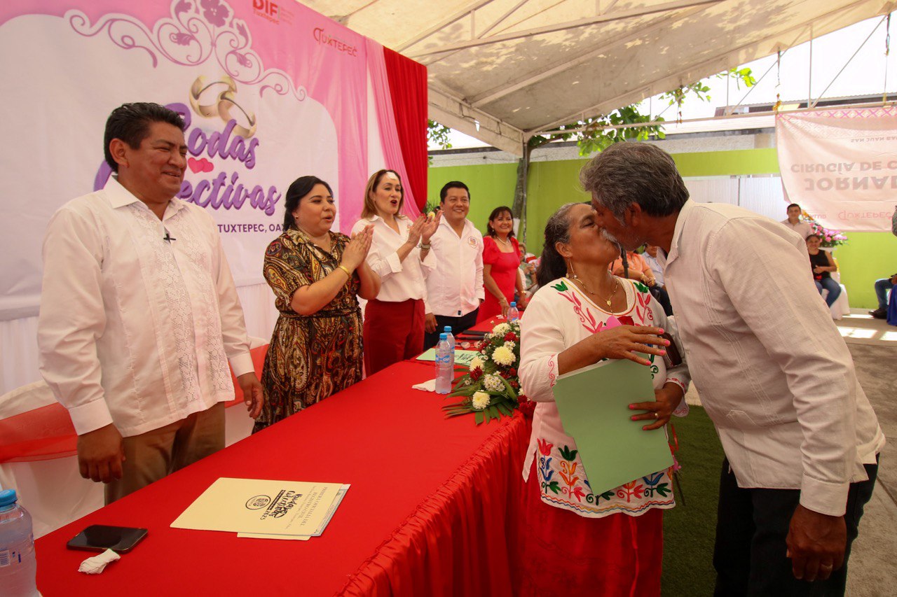 La Presidenta del DIF Tuxtepec, Erika Vásquez Estrada, y el Presidente Municipal, Irineo Molina Espinoza, entregaron las actas de matrimonio y felicitaron a todas las parejas