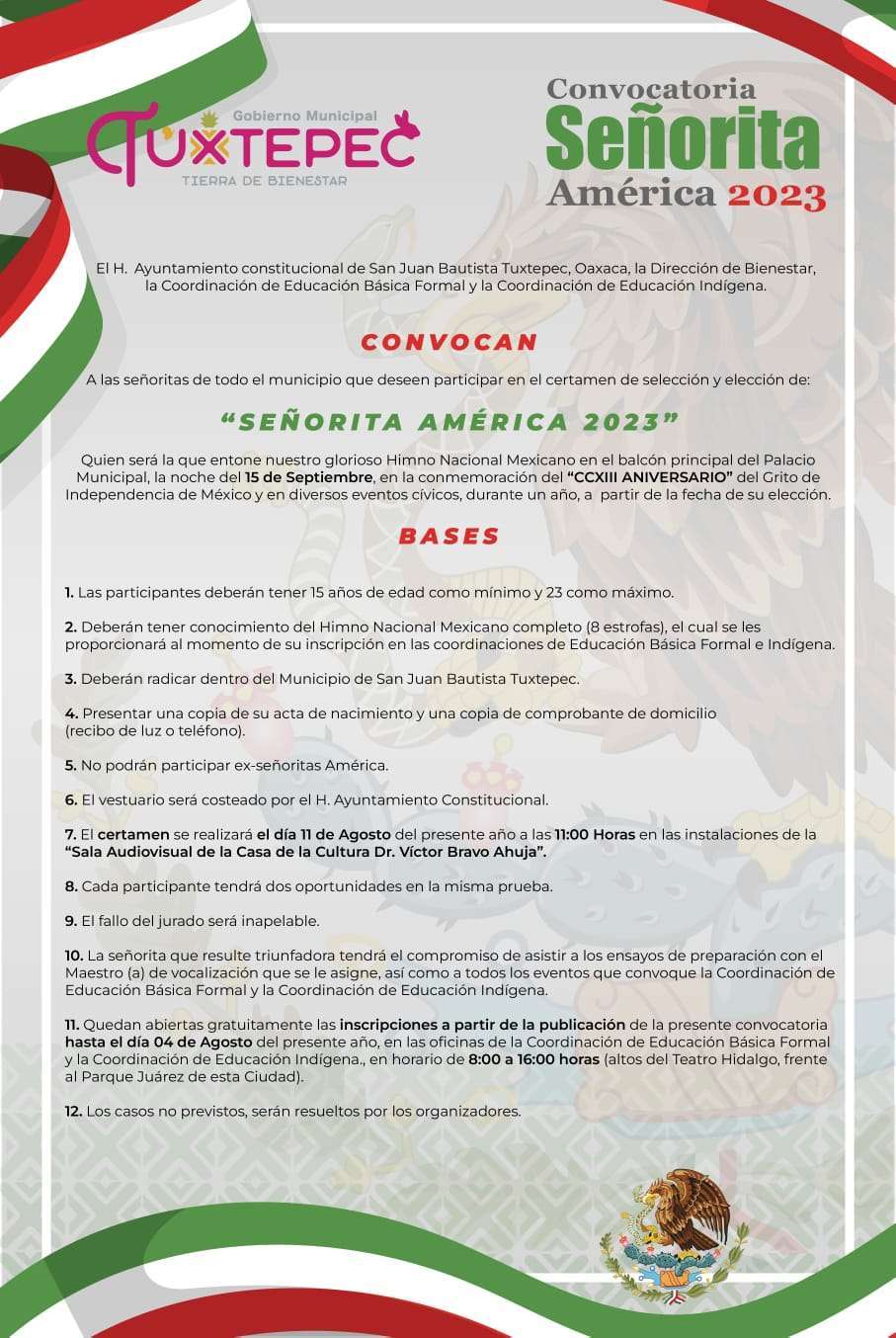 El Gobierno Municipal Tuxtepec se prepara para la elección de la Señorita América 2023, quien tendrá bajo su responsabilidad la entonación del Himno Nacional Mexicano a partir del 213 Aniversario…