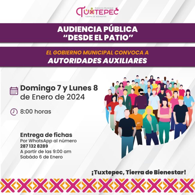 El Gobierno Municipal Tuxtepec invita a las Autoridades Auxiliares a la Audiencia Pública “Desde el Patio” este Domingo 7 y Lunes 8 de de Enero a las 8:00 hrs.