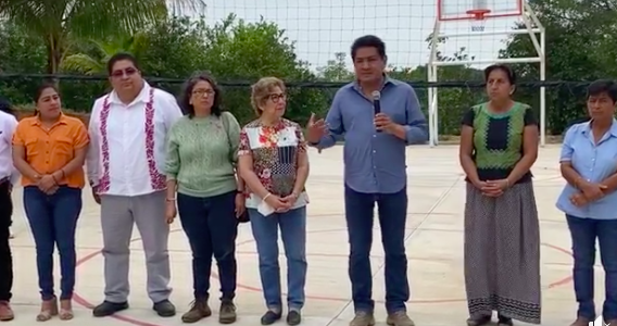 Al inaugurar la Construcción de la Cancha Deportiva de la Telesecundaria de la comunidad de San Isidro Las Piñas.