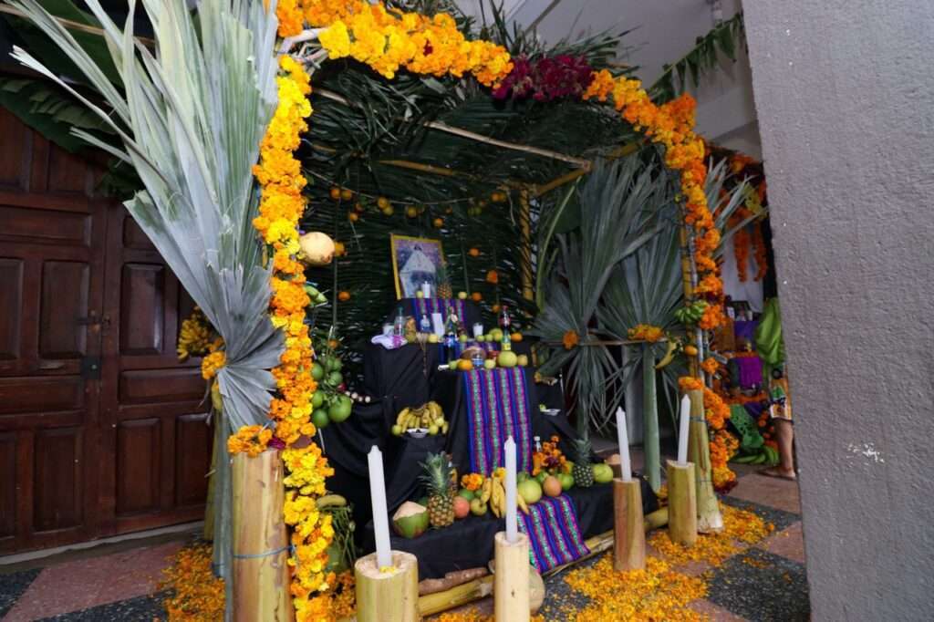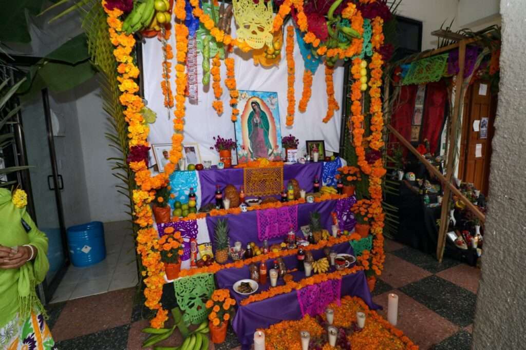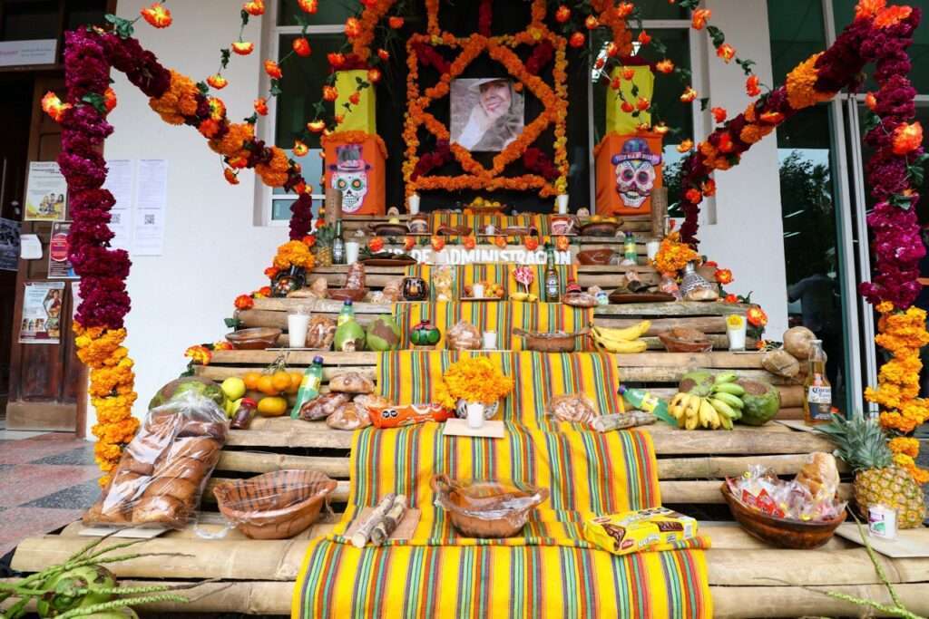 Los altares destacan elementos tradicionales y místicos que son característicos de la celebración del Día de los Muertos en México. Entre los elementos más prominentes se encuentran las fotografías de los seres queridos fallecidos, acompañadas de velas, flores de cempasúchil, incienso y alimentos favoritos de los difuntos. Los altares también incorporan calaveras de azúcar, papel picado y objetos personales que evocan la memoria de los seres amados.