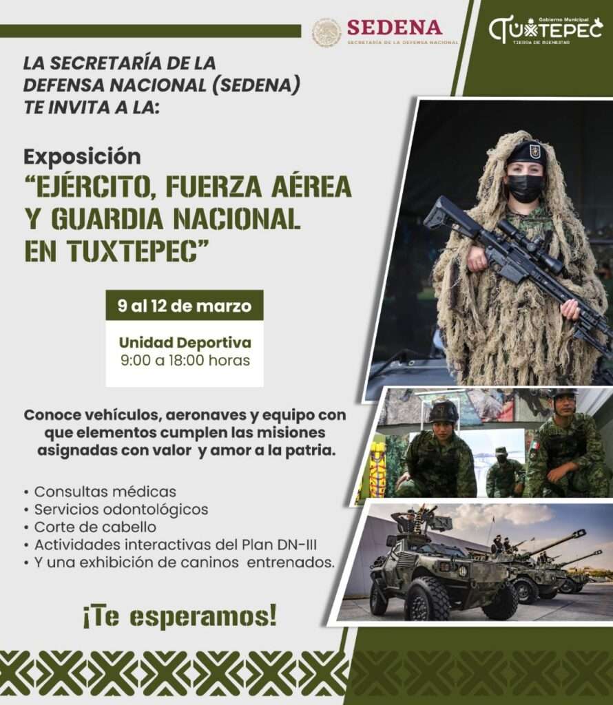 La Secretaría de la Defensa Nacional (SEDENA)y el Gobierno Municipal Tuxtepec te invitan a conocer la labor de elementos que cuidan de nuestra nación.